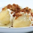 калдуны бульбяныя са свінінай і гыбамі, соус з часныком і зелянінай