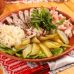 грудзінка па-сялянску, каўбаса вясковая смажаная, салат з капусты, соленыя агуркі, соус з брусц з хрэнам, салата