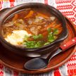 страва ў збаночку, прыгатаваная на аснове таматавай пасты з бабовай фасоляй, мучнымі клецкамі з дабаўленнем хатняй каўбаскі, салёнай грудзінкі і вэнджанага балычка