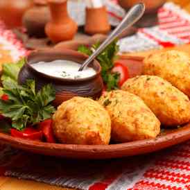 піражкі бульбяныя, фаршаваныя грыбамі з пікантным соўсам, падаюцца з марынаваным памідорам, зелянінай
